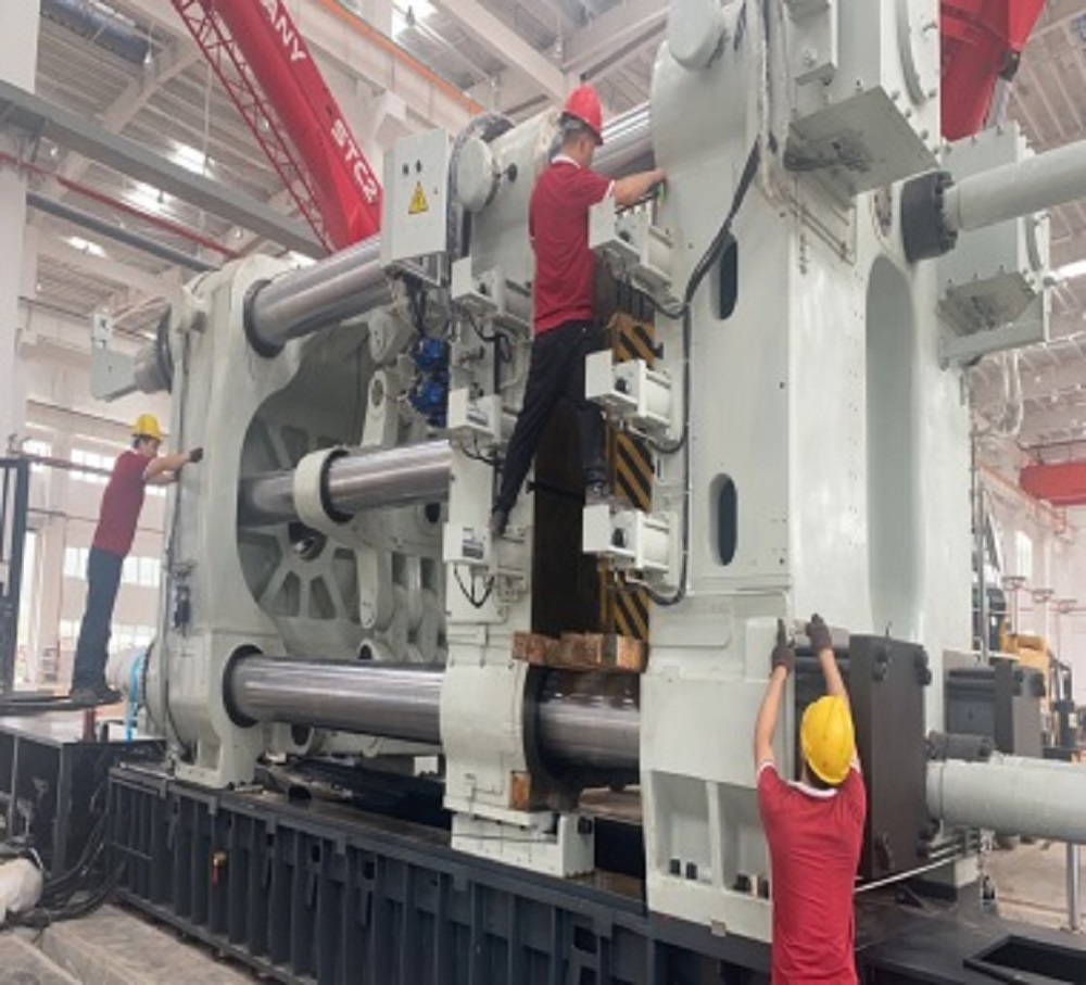 春興一號(hào)4000噸壓鑄機(jī)是春興目前擁有的最大噸位壓鑄機(jī),目前壓鑄機(jī)的組裝已經(jīng)初見雛形,一個(gè)龐然大物赫然佇立在新建成的壓鑄車間。截至發(fā)稿,力勁廠家的調(diào)試模具也已經(jīng)開始吊裝。由于正直酷暑,力勁廠家和春興現(xiàn)場(chǎng)工作人員冒著高溫,按照排好的安裝計(jì)劃緊鑼密鼓地加緊安裝,春興方的配合人員在保障好現(xiàn)場(chǎng)安裝需要的同時(shí),也積極準(zhǔn)備壓鑄機(jī)調(diào)機(jī)所用的物資,力爭(zhēng)早日安裝好進(jìn)入調(diào)試階段。